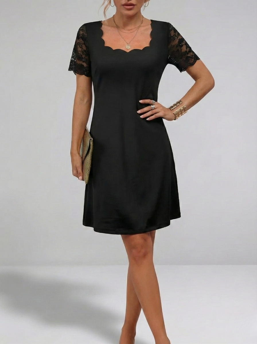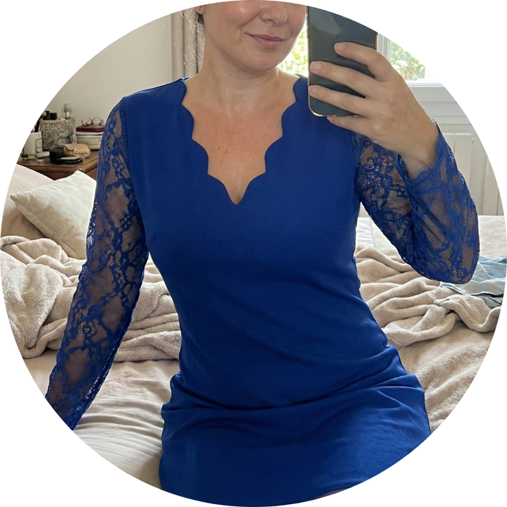 Les manches en dentelle fine dessinent un jeu de transparence élégant et féminin. Elles habillent les bras avec délicatesse, offrant une allure raffinée sans jamais en faire trop. Le décolleté subtilement échancré met en valeur le port de tête avec grâce et distinction.
